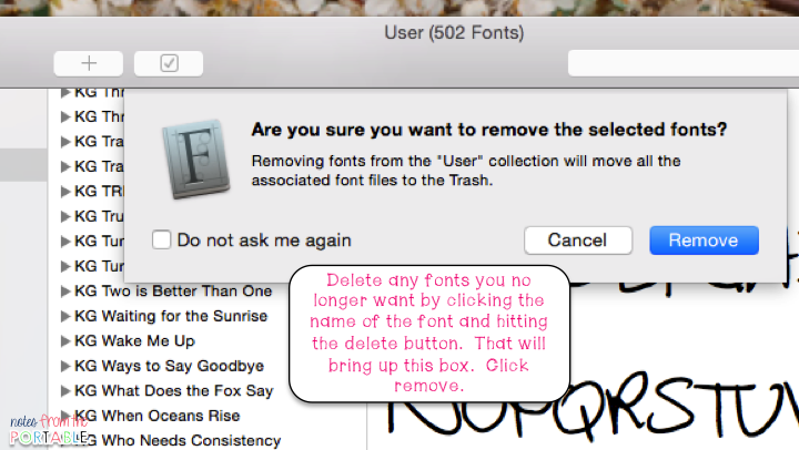 Optional Step 5: Delete any fonts you don’t use. Click the font name and then click delete. This will bring up a pop up box. Just click remove. Unfortunately you cannot delete all of those unused fonts that came with your computer.